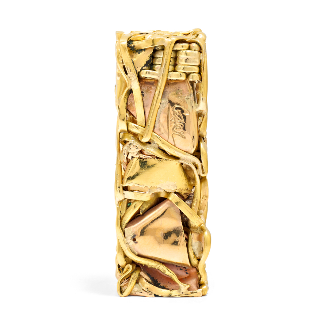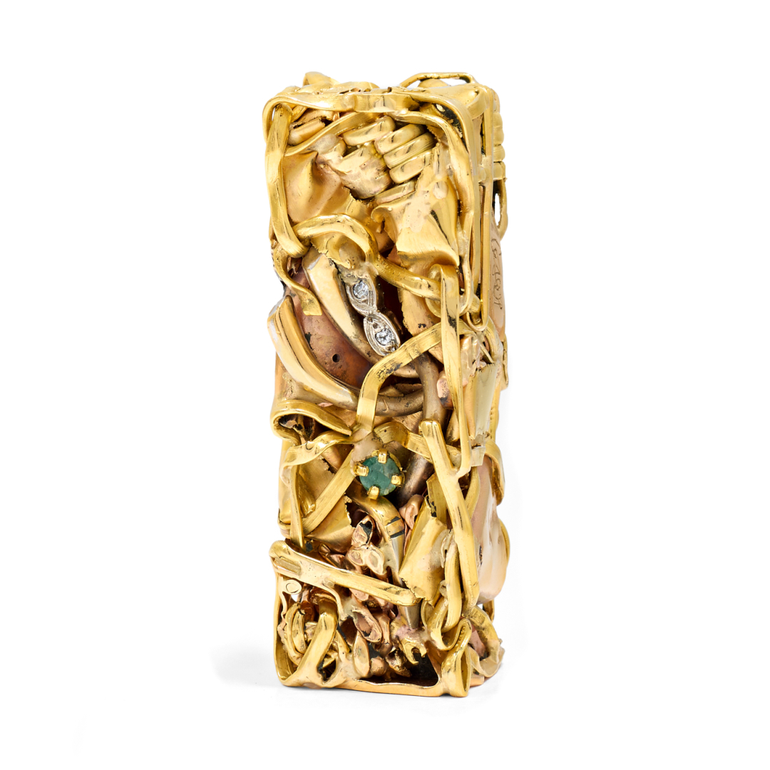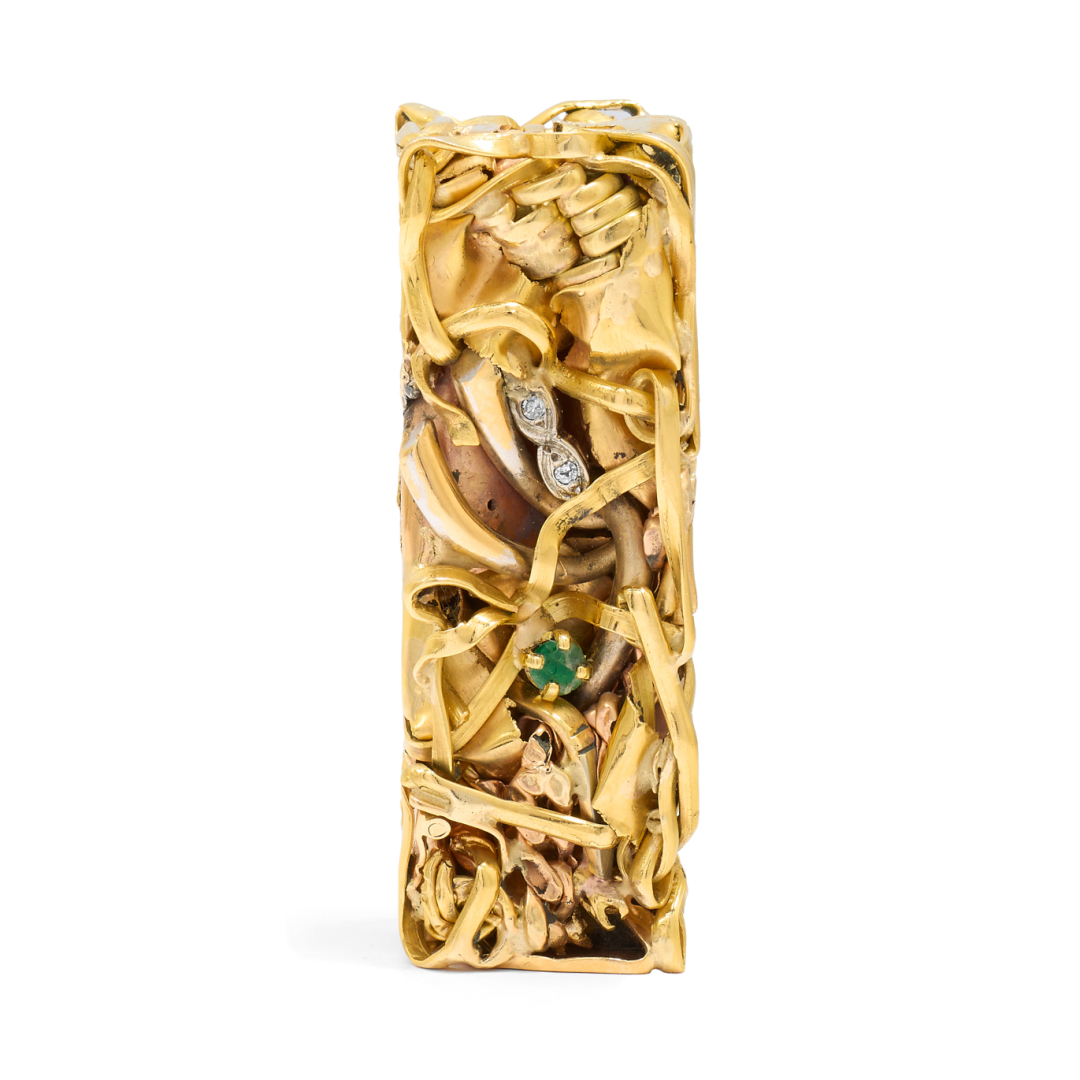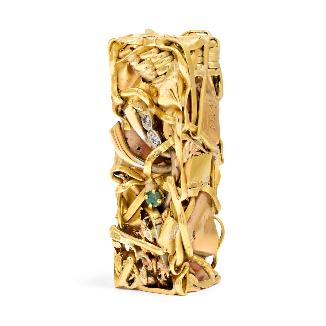 Signed on the side, hallmarked 18-karat gold (750/1000). Gross weight 66 g. Made from compressed jewels with precious stones, accompanied by a leather necklace with a gold clasp.