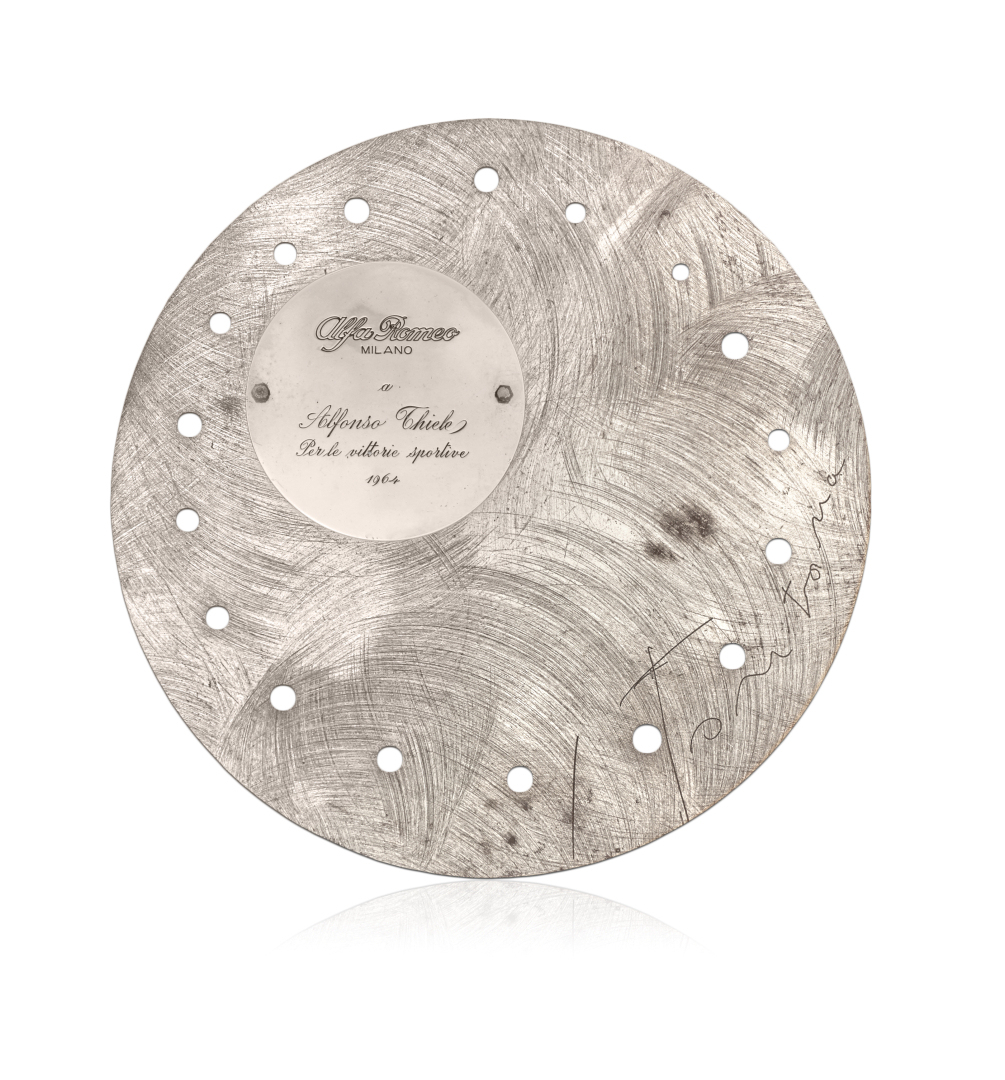 Engraved signature on the lower right recto and screwed plaque 'Alfa Romeo, Milano' with dedication 'A Alfonso Thiele per le vittorie sportive 1964'.