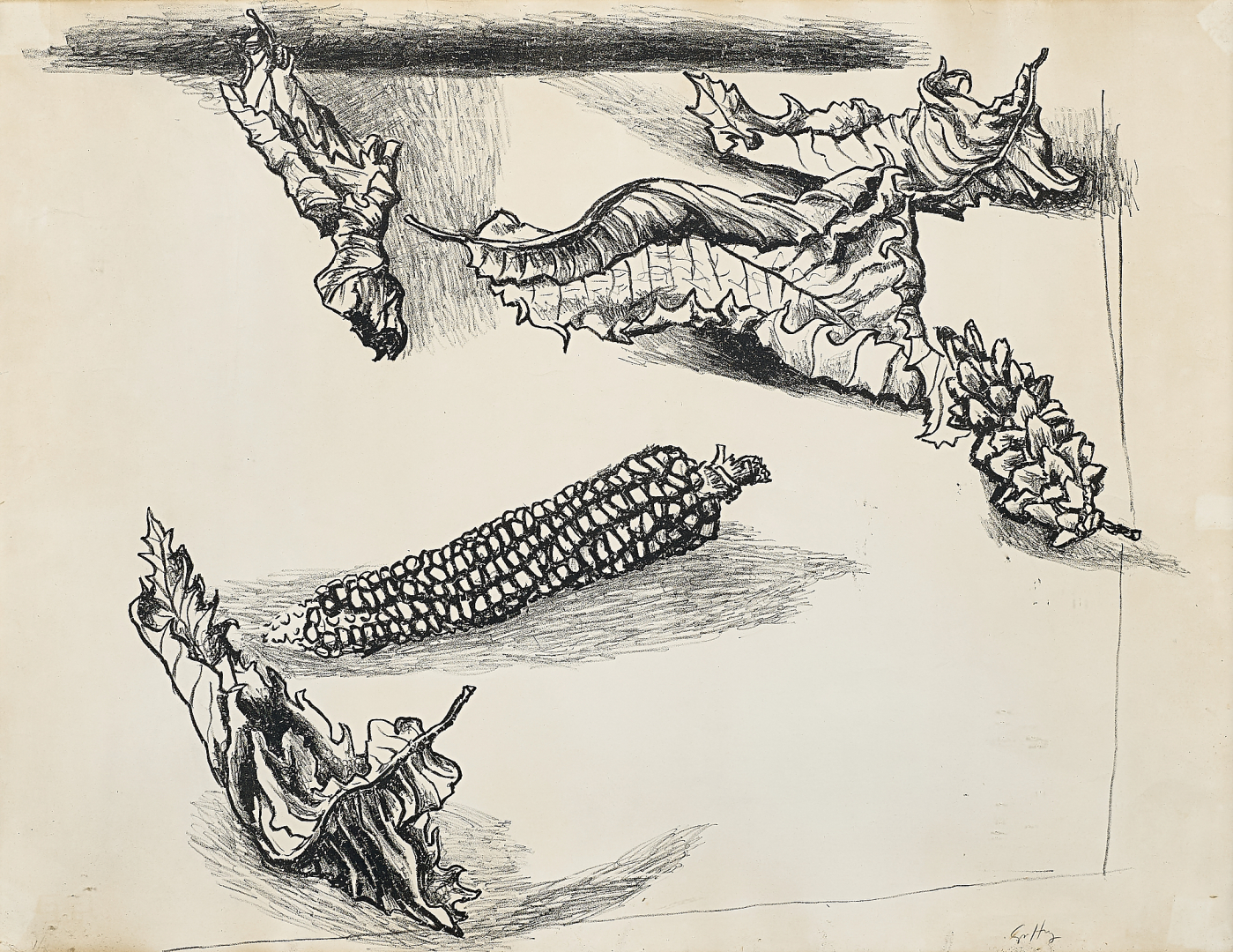 Completes the lot: Pannocchie e foglie, 1966, color lithograph, illegible edition, 19.7 x 25.6 in, signed and numbered on the lower recto.