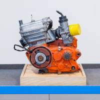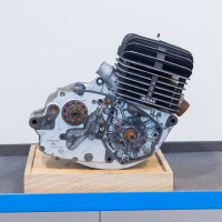Motore SWM profondamente elaborato, con flangiatura laterale condotto di aspirazione, cilindro ruotato di 180° con scarico posteriore, carburatore e impianto di accensione completo. Si consiglia un controllo generale prima dell’utilizzo.