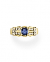 in oro giallo con zaffiro blu ovale di ct 0,80 ca. affiancato da diamanti taglio brillante di ct 0,50 ca.