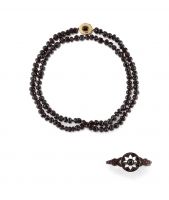 formato da una lunga collana in granati sfaccettati di mm 8,00-9,00 con chiusura ovale in oro giallo e granato e da un antico bracciale rigido in oro basso e granati di probabile manifattura cecoslovacca.
