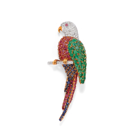 raffigurante un pappagallo in oro bianco e giallo con testa in pavé di diamanti taglio huit-huit per complessivi ct 0.75 ca., ala in smeraldi taglio rotondo per complessivi ct 2.00 ca., corpo e piume in rubini taglio rotondo per complessivi ct 2,20 ca. e zaffiri