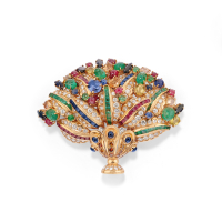 a forma di ventaglio in oro giallo, diamanti per circa ct 4, corindoni e smeraldi di vari tagli per complessivi 25 ct.