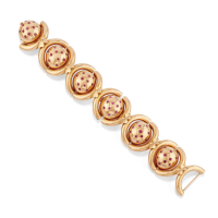 in oro rosa formato da semicerchi snodati che trattengono semisfere in rubini sintetici taglio rotondo incastonati a stella. La maglia centrale è apribile e rivela un orologio Wiler-Vetta con quadrante rotondo e carica manuale