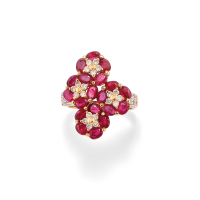 realizzato in oro giallo a forma di fiore con diamanti taglio brillante rotondo per ct. 0,30 ca. e rubini taglio ovale per complessivi ct 2.00 ca.