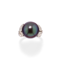 in oro bianco e perla di Tahiti a bottone di mm 13,16 ca. con quattro foglie di diamanti taglio marquise ai lati per complessivi ct 1,60 ca.