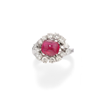 in oro bianco realizzato con gambo a tre fili, diamanti taglio brillante rotondo e taglio marquise per complessivi ct. 1.40 ca. e rubino taglio cabochon di 4 ct. ca.