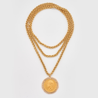 lunga collana in oro giallo lavorata a maglia intrecciata con pendente con moneta da 100 Lire di Carlo Alberto. Lievi difetti sul pendente.