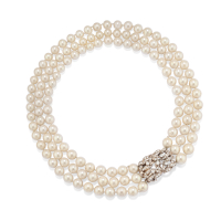 realizzata a tre fili di perle digradanti da mm. 6 a mm. 8 trattenuti da una chiusura in oro bianco e giallo e diamanti taglio brillante rotondo e taglio huit-huit.