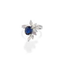 in platino con zaffiro ovale di ct 2,50 ca. ornato da sette diamanti taglio marquise di ct 1,20 ca. Circa 1960.