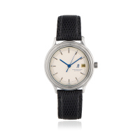 Cassa: firmata, n. 2704903, in acciaio, fondello con viti. Quadrante: firmato, bianco porcellanato, indici applicati luminescenti, secondi al centro, data.