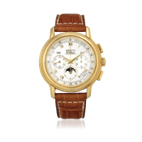 Quadrante: firmato, in smalto bianco, indici applicati, secondi continui, contatori dei 30 minuti e delle 12 ore, fasi lunari, indicazioni del