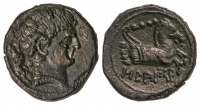 As. 120-20 a.C. SECAISA (BELMONTE, Zaragoza). Anv.: Cabeza masculina a derecha, detrás leona. Rev.: Jinete con cetro a derecha, debajo leyenda ibérica. 16,25 grs. AE. Acuñación floja en parte. Pátina oscura. RARA. AB-No cat.; Vill-4 mismo ejemplar. (MBC+).