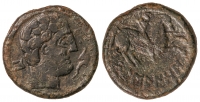 As. 120-20 a.C. SEGISANOS (CANALES DE LA SIERRA, La Rioja). Anv.: Cabeza masculina a derecha, delante delfín, detrás signo ibérico S. Rev.: Jinete con lanza a derecha, debajo leyenda ibérica curva. 9,30 grs. AE. Pátina verde. RARA. AB-2167; Vill-1. MBC-/MBC.