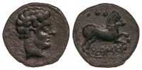 Semis. 120-20 a.C. CESE (TARRAGONA). Anv.: Cabeza masculina a derecha. Rev.: Caballo galopando a derecha, debajo leyenda ibérica. 7,10 grs. AE. Pátina verde. AB-2303; Vill-12. MBC.