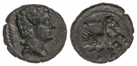 Uncia. 120-20 a.C. CESE (TARRAGONA). Anv.: Cabeza de Mercurio a derecha. Rev.: Caballo sentado a derecha, encima punto, debajo leyenda ibérica. 1,60 grs. AE. Pátina marrón. AB-2347. MBC/MBC-.