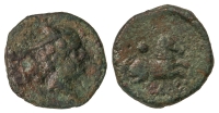Cuadrante. 120-20 a.C. CESE (TARRAGONA). Anv.: Cabeza masculina a derecha, detrás timón. Rev.: Medio Pegaso a derecha, encima tres puntos, debajo leyenda ibérica. 2,93 grs. AE. Pátina oscura. AB-2336; Vill-70. MBC.