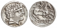 Denario. 120-20 a.C. TURIASU (TARAZONA, Zaragoza). Anv.: Cabeza barbada a derecha, con letras ibéricas Tu y Ca, debajo del cuello creciente. Rev.: Jinete con lanza a derecha, debajo leyenda ibérica. 3,95 grs. AR. Restos de brillo original. MUY ESCASA. AB-2416; Vill-17. leggi tutto
