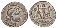 Denario. Acuñada el 54-51 a.C. JULIO CÉSAR. Anv.: Elefante a derecha, delante una serpiente. En exergo: CAESAR. Rev.: Símpulo, aspersorio, hacha y apex. 3,4 grs. AR. C-49; Cal-640; FFC-50; Crawford-443/1; Sydenham-1006. MBC-.
