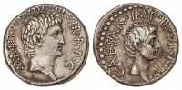 Denario. Acuñada el 39 a.C. MARCO ANTONIO y AUGUSTO. Anv.: M. ANTON. IMP. III VIR. R. P.C. Cabeza descubierta de Marco Antonio a derecha. Rev.: CAESAR IMP. III VIR. R. P. C. Cabeza descubierta de Augusto a derecha. 4,10 grs. AR. Cal-159; FFC-3; Se-1b. EBC-/MBC+.