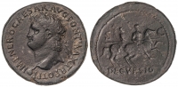 Dupondio. Acuñada el 37-38 d.C. NERÓN y DRUSO CÉSARES. Anv.: NERO ET DRVSVS CAESARES. Nerón y Druso a galope a derecha. Rev.: C. CAESAR DIVI. AVG. PRON. AVG. P. M. TR. P. IIII P. P. alrededor de S. C. 15,52 grs. AE. Pátina marrón. C-1. (MBC).