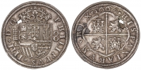 8 Reales. (1617). SEVILLA. V./D. 27,39 grs. Según Calbetó esta corrección de ensayadores solo se conoce en esta fecha. Acuñación algo floja. RARA. Cal-No cat. (MBC-).