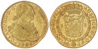 8 Escudos. 1808. LIMA. J.P. 26,97 grs. Cospel ligeramente segmentado y acuñación parcialmente floja en escudo del reverso. (Pequeña hojita en anverso). Restos de brillo original. Cal-29; XC-1007. EBC.