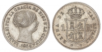 Prueba no adoptada 25 Céntimos o 4ª parte de Real. 1854. MADRID. 8,95 grs. AE. Realizada por Fernández Pescador en la Casa de la Moneda de Madrid. Reverso girado 25º. Canto liso. Restos de brillo original. RARA. SC.