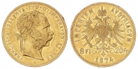 8 Florines-20 Francos. 1874. FRANCISCO JOSÉ I. 6,42 grs. AU. Restos de brillo original. Fr-502; KM-2269. EBC.