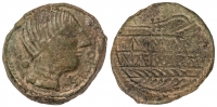 Semis. 150-50 a.C. LASTIGI (Cerca de AZNACÓLLAR, Sevilla). Anv.: Cabeza masculina con casco a derecha. Rev.: Dos espigas a derecha, entre ambas LASTIGI. 6,12 grs. AE. (Leves oxidaciones) . MUY ESCASA. AB-1673; ACIP-2371. MBC+.