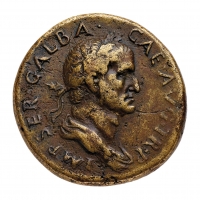 Sesterzio databile al 68 d.C. - Zecca: Roma - Diritto: testa laureata dell'Imperatore a destra - Rovescio: il Senato rappresentato da un uomo anziano e togato nell'atto di incoronare Galba, stante a sinistra con la Vittoria sulla mano destra - gr. 28,30 - Molto rara - leggi tutto