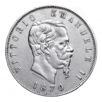 5 Lire 1870 - Zecca: Roma - Diritto: effigie del Re a destra - Rovescio: stemma di Casa Savoia coronato e circondato dal Collare dell'Annunziata - Non comune - Di qualità molto buona