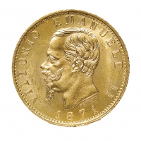 20 Lire 1871 - Zecca: Roma - Diritto: effigie del Re a sinistra - Rovescio: stemma di Casa Savoia coronato e circondato dal Collare dell'annunziata - Rara - Di qualità molto buona