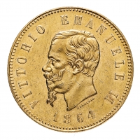 50 Lire 1864 PCGS AU58 - Zecca: Torino - Diritto: effigie del Re a sinistra - Rovescio: stemma di Casa Savoia coronato e circondato dal Collare dell'Annunziata - Lievi segni di contatto, ma di qualità molto buona, con tracce dell'originale lucentezza dei fondi - leggi tutto