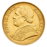Pio IX (1846-1870) - 100 Lire 1868 Anno XXIII - Zecca: Roma - Diritto: effigie del Papa a sinistra - Rovescio: valore e data entro corona di alloro - gr. 32,11 - Molto rara, solo 440 esemplari coniati - Probabili tracce di montatura, BB