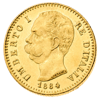 20 Lire 1884 - Zecca: Roma - Diritto: effigie del Re a sinistra - Rovescio: stemma di Casa Savoia coronato e circondato dal Collare dell'Annunziata - gr. 6,45 - Rara - Migliore di SPL
