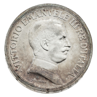 5 Lire Quadriga Briosa 1914 - Zecca: Roma - Diritto: effigie del Re a destra - Rovescio: l'Italia elmata con scudo e ramo d'ulivo su quadriga briosa a destra - Sigillata ("SPL+")