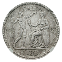 20 Lire Littore 1927 Anno VI NGC MS 66 - Zecca: Roma - Diritto: effigie del Re a destra - Rovescio: littore con fascio nella mano destra saluta romanamente l'Italia seduta con fiaccola e scudo sabaudo - Cert. #6647133-012