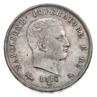 Napoleone I Re d'Italia (1805-1814) - 5 Lire 1811 - Zecca: Milano - Diritto: effigie di Napoleone a destra - Rovescio: stemma sovrapposto all'aquila napoleonica entro un padiglione coronato e riccamente ornato - gr. 24,89 - q.SPL