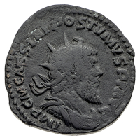 Doppio Sesterzio databile agli anni 264-265 d.C. - Zecca: Lugdunum - Diritto: busto radiato di Postumo a destra - Rovescio: Minerva in cammino verso sinistra, tiene un ramo di palma nella mano destra e uno scudo nella sinistra - gr. 26,39 - Rara - Tracce di ribattitura, leggi tutto