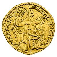 Antonio Venier (1382-1400) - Ducato - Zecca: Venezia - Diritto: il Doge genuflesso riceve da San Marco il vessillo della Repubblica - Rovescio: Gesù Cristo benedicente entro cornice a mandorla - gr. 3,50 - SPL