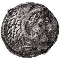 Dominazione punica - Tetradramma databile al periodo 300-289 a.C. - Zecca: Entella - Diritto: testa di Eracle a destra ricoperta dalle fauci del leone - Rovescio: protome equina a sinistra e palmizio - gr. 16,26 - SPL