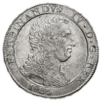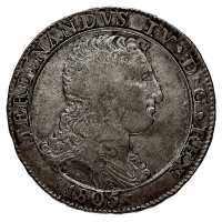 Ferdinando IV di Borbone (1799-1805) - Piastra da 120 Grana 1805 - Zecca: Napoli - Diritto: effigie del Re a destra - Rovescio: stemma coronato - gr. 27,54 - Rara tipologia con capelli lisci - Splendida patina, migliore di SPL