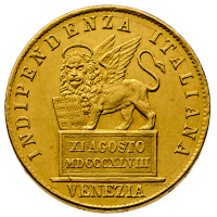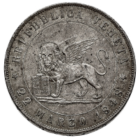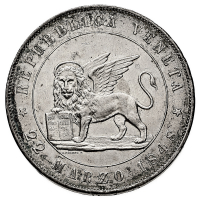 Venezia - 5 Lire 1848 - Zecca: Venezia - Diritto: leone di San Marco a sinistra con la testa di fronte su basamento, regge il Vangelo aperto con la zampa anteriore destra - Rovescio: valore entro corona di alloro e di quercia - gr. 24,98 - Fondi lucenti, migliore di SPL