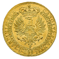 Da 4 Zecchini 1745 - Zecca: Torino - Diritto: aquila coronata con stemma sabaudo in petto circondata dal Collare dell'Annunziata - Rovescio: scena dell'Annunciazione - gr. 13,87 - Molto rara - Lievi segni sul contorno, comunque SPL