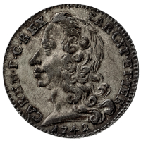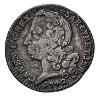 Mezza Lira 1742 - Zecca: Torino - Diritto: testa del Re a sinistra - Rovescio: stemma completo di Casa Savoia coronato e ornato dal Collare dell'Annunziata - gr. 2,63 - Rara - BB