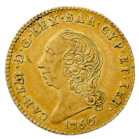 Mezza Doppia 1756 - Zecca: Torino - Diritto: effigie del Re a sinistra - Rovescio: stemma completo di Casa Savoia coronato e circondato dal Collare dell'Annunziata - gr. 4,79 - Rara - Lieve graffio al rovescio, migliore di BB