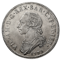 Quarto di Scudo 1774 - Zecca: Torino - Diritto: effigie del Re a sinistra - Rovescio: stemma completo di Casa Savoia coronato e circondato dal Collare dell'Annunziata - gr. 8,78 - Rara - SPL
