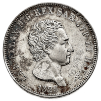 5 Lire 1829 - Zecca: Genova - Diritto: effigie del Re a destra - Rovescio: stemma completo di Casa Savoia coronato e circondato dal Collare dell'Annunziata - gr. 25,00 - Lievi segni di contatto, SPL
